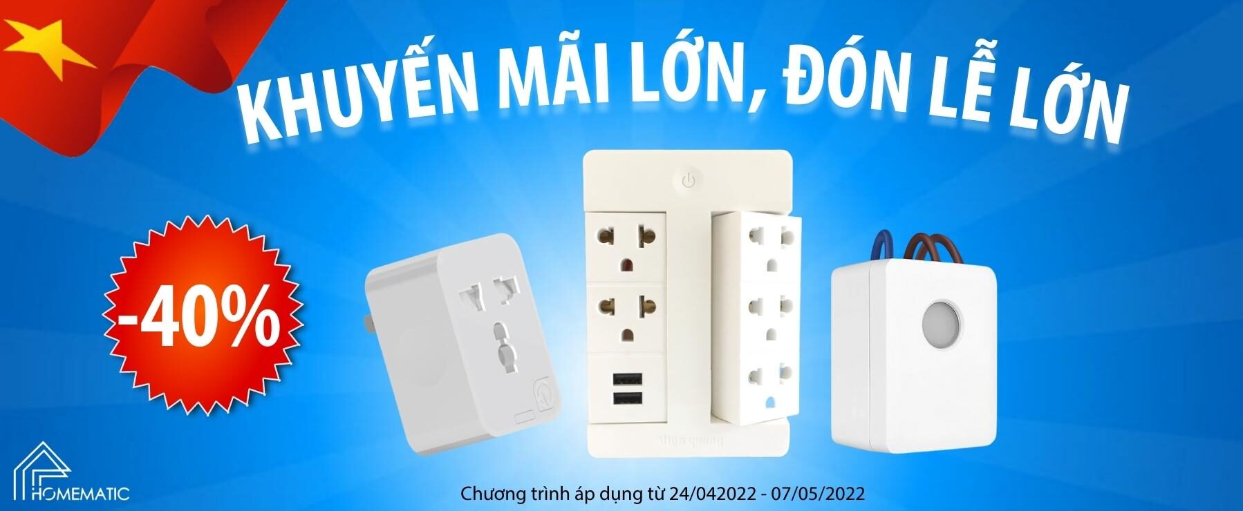 Nhân dịp đại lễ, Homematic mang đến Quý khách hàng chương trình “Khuyến mãi lớn-đón lễ lớn 30/4 – 1/5” bùng nổ giảm giá nhiều dòng sản phẩm: Ổ cắm thông minh, Ổ khóa vân tay, máy xay tỏi ớt, camera mô hình, Đui đèn cảm biến chuyển động.