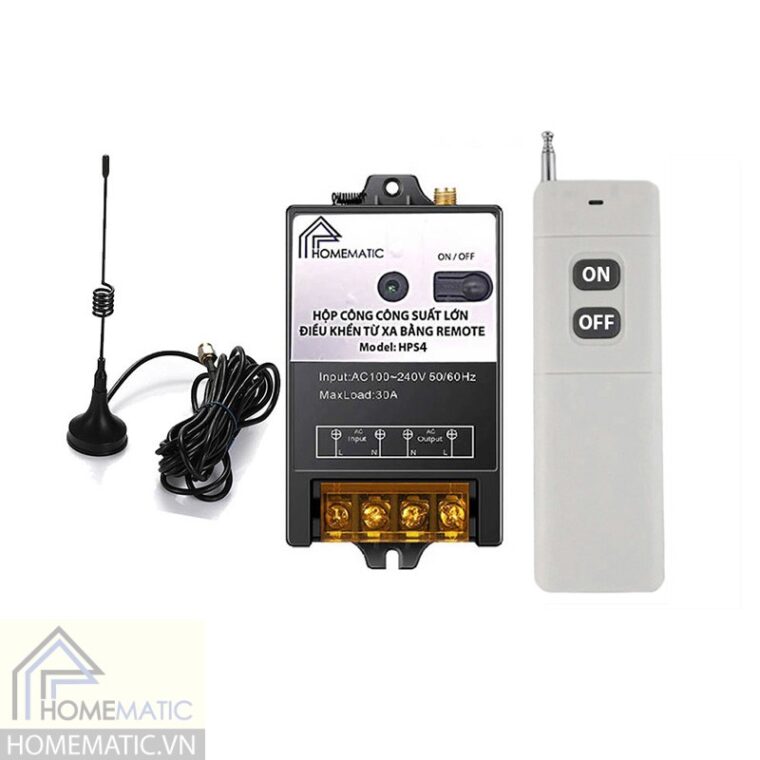 Bộ công tắc 30A điều khiển bằng remote tầm xa 3km HPS4 điều khiển đóng cắt thiết bị có dòng chịu tải ≤ 30A từ xa với khoảng cách 3000m (không vật cản), không chỉ thích hợp sử dụng cho các thiết bị gia dụng công suất lớn như máy bơm, bình nóng lạnh, điều hòa… mà còn phục vụ tốt cho các hoạt động nông nghiệp tưới tiêu, ấp sưởi…