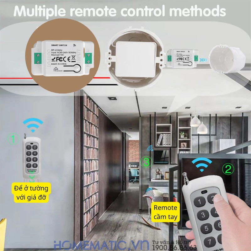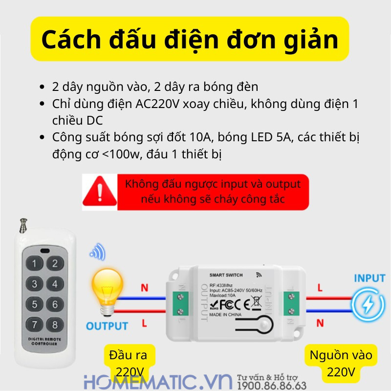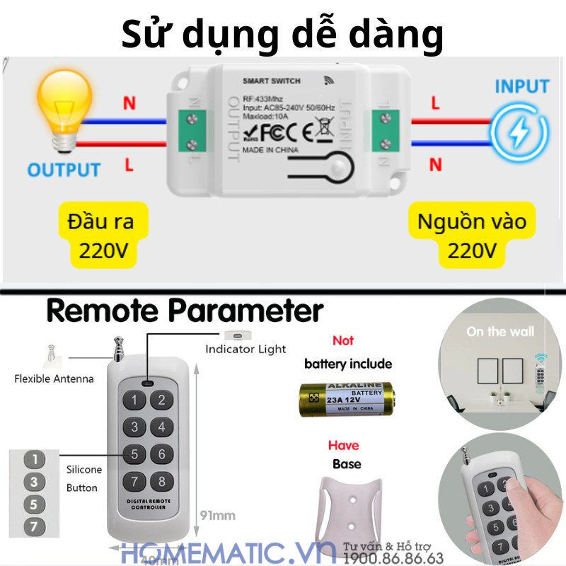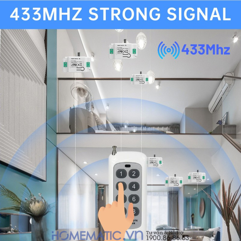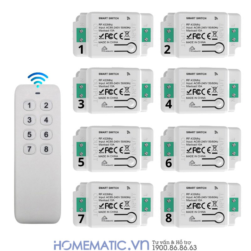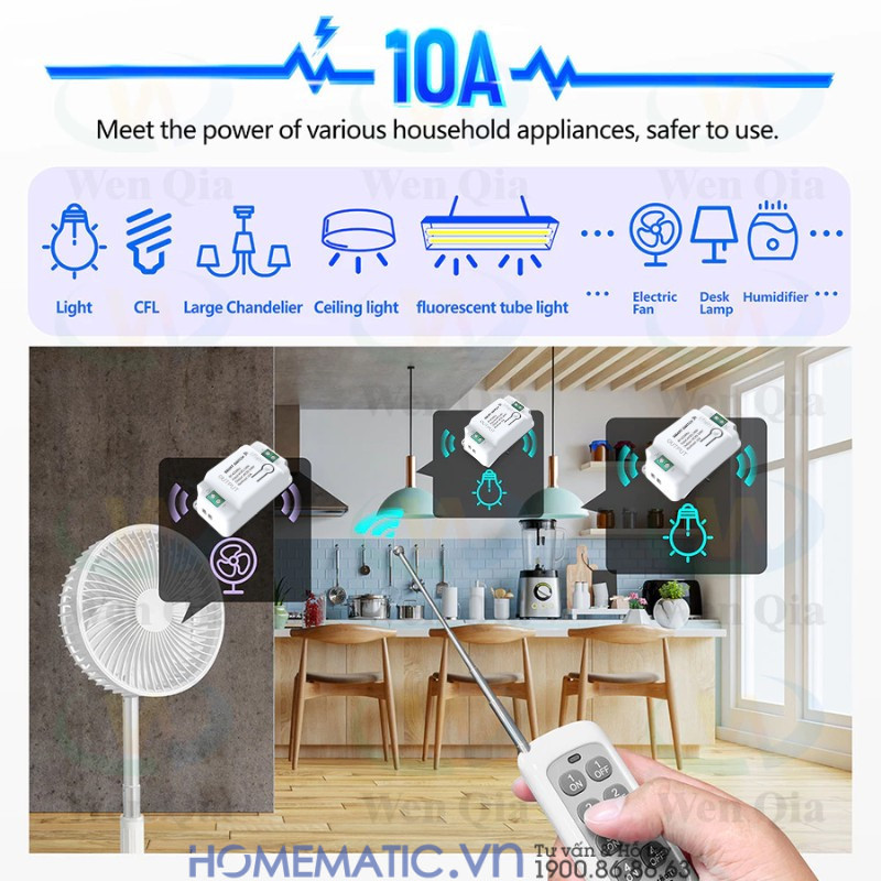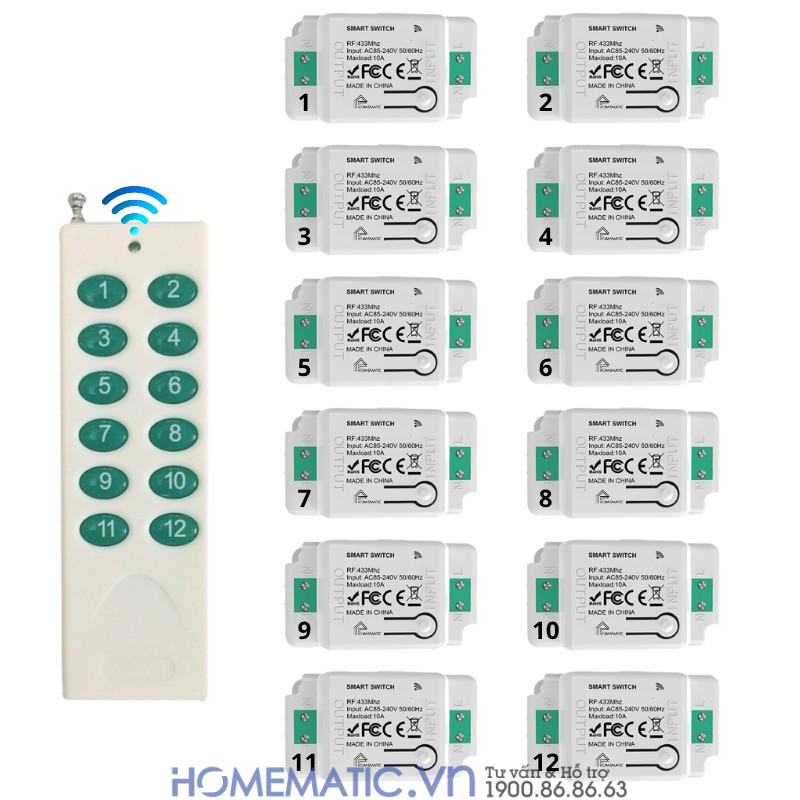 Hỗ trợ tất cả đèn phổ thông: LED, huỳnh quang, công suất đến 300W (3A), đủ cho cả gia đình 4-5 người dùng thoải mái. Bộ sản phẩm có tùy chọn remote 8 nút và 12 nút tùy theo nhu cầu của bạn