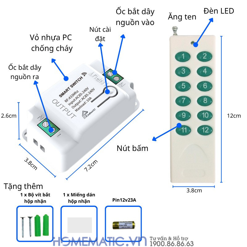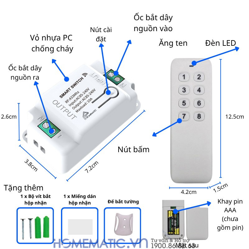 Kích thước | Hộp công tắc: 7.2×3.8×2.6 cm Remote:4×9.1×1.5 cm |
