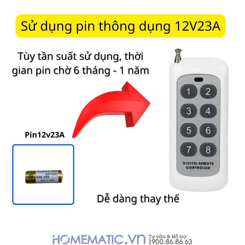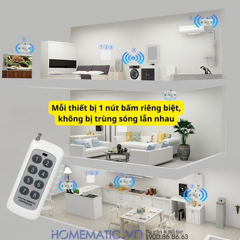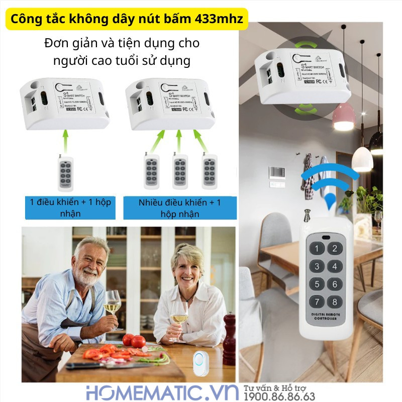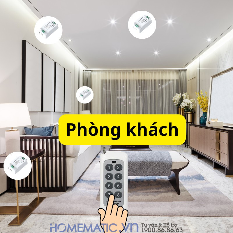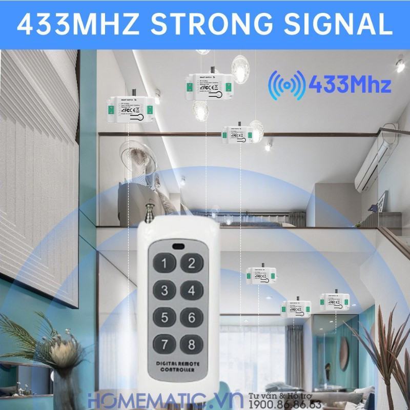 - Khoảng cách điều khiển lên tới 50m: Remote hoạt động ổn định, xuyên tường, cửa và vách ngăn, đủ khả năng phủ sóng từ tầng trệt lên đến tầng 3. Một bộ công tắc có thể quản lý đồng thời 8 hoặc 12 đèn tại các vị trí khác nhau.