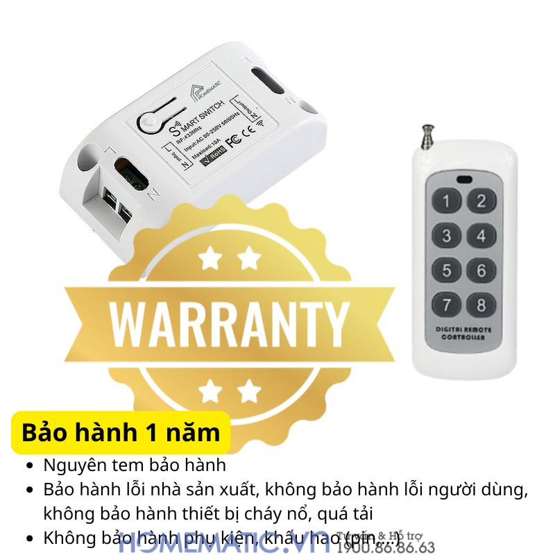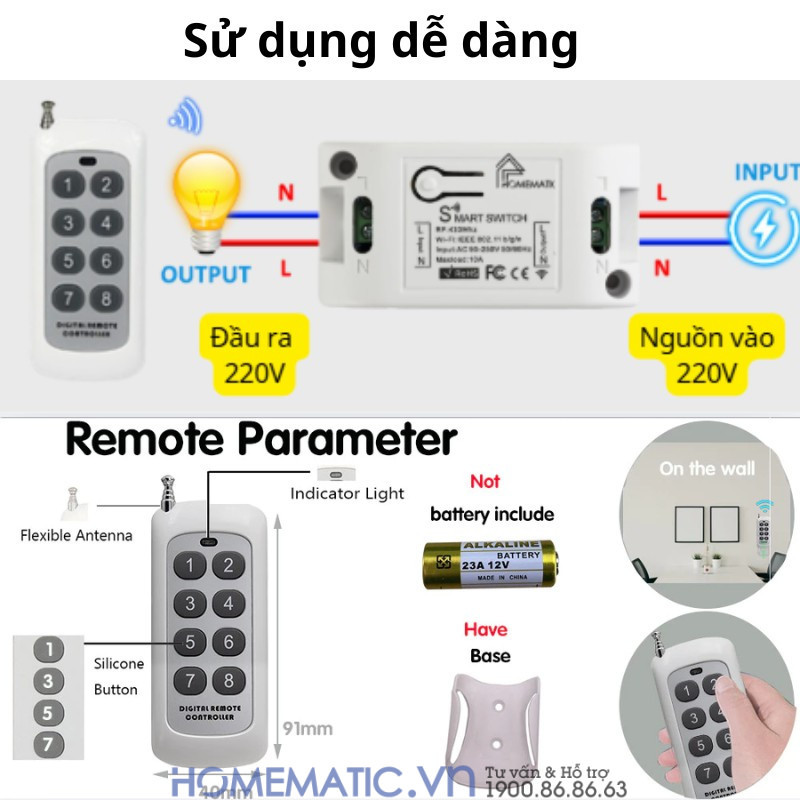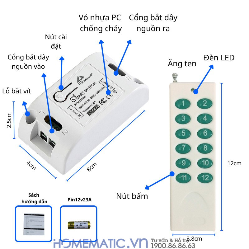 | Kích thước | Dài 8cm x Rộng 4cm x Cao 2.5cm ( Đối với công tắc) Dài 9,1cm x Rộng 4cm x Cao 1,5cm ( Đối với remote 8 nút) Dài 12cm x Rộng 3,8cm x Cao 1cm ( Đối với remote 12 nút) |