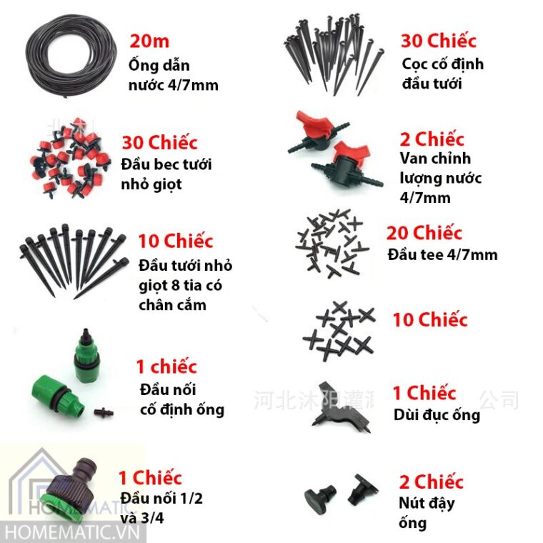 Bộ phụ kiện tưới nước nhỏ giọt cho 20 cây dây 20m-DRIP20 cung cấp các phụ kiện ống dẫn nước, béc tưới nhỏ giọt, đầu tưới, đầu chia, van …tất cả bạn cần để hỗ trợ chăm sóc cây cảnh