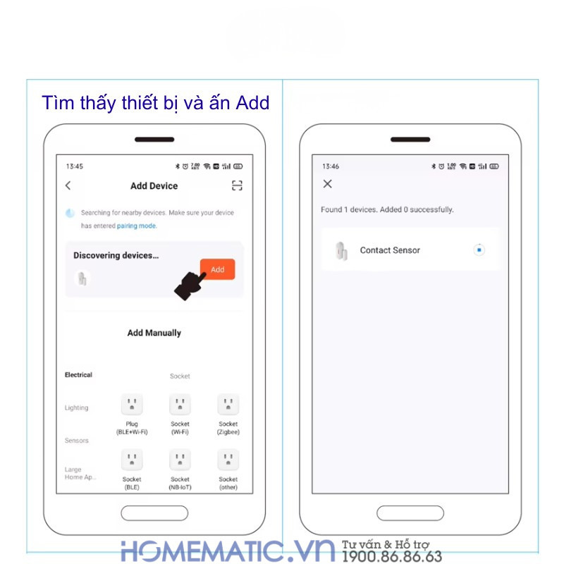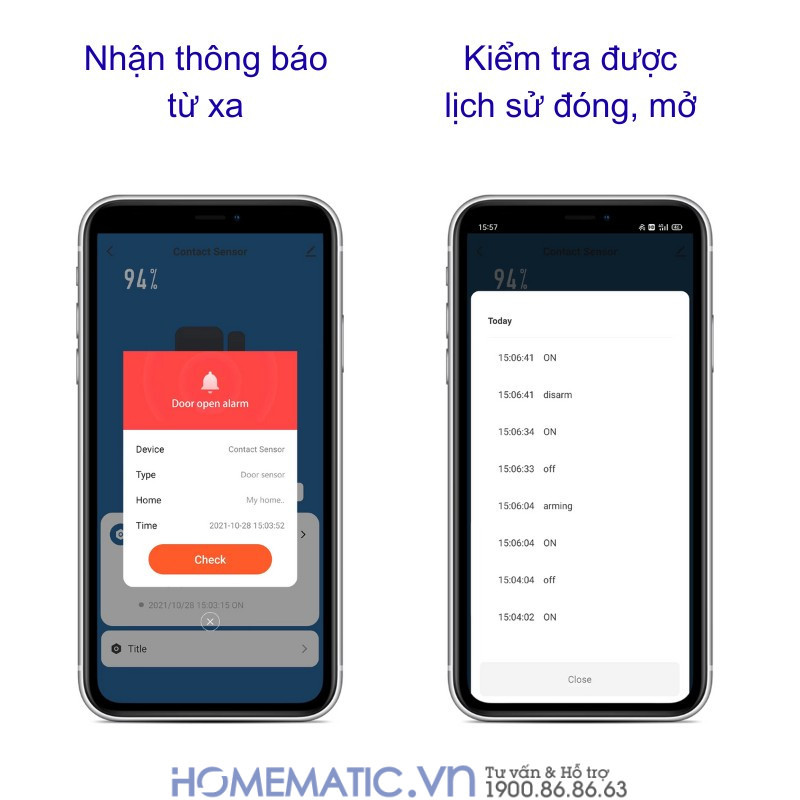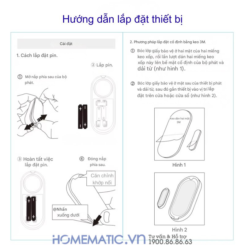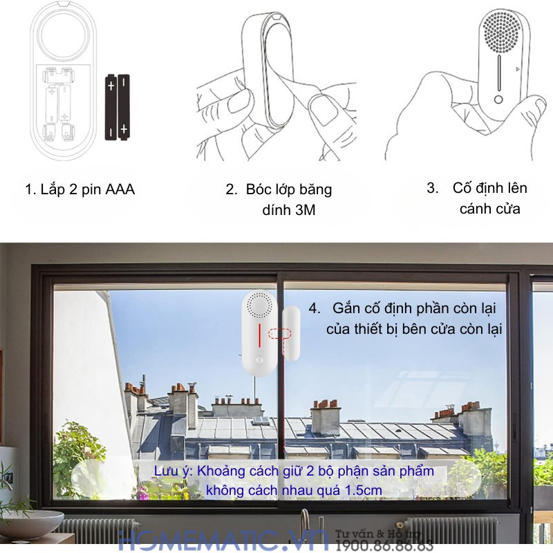 - Lắp đặt không dây dễ dàng, chỉ việc dán lên cửa và lắp pin. Thiết bị sử dụng 2 pin AAA dễ dàng thay thế pin, thời lượng lên tới 6 tháng và có báo pin yếu ở app.