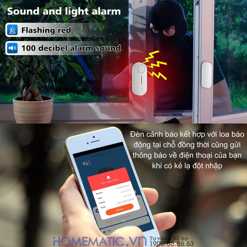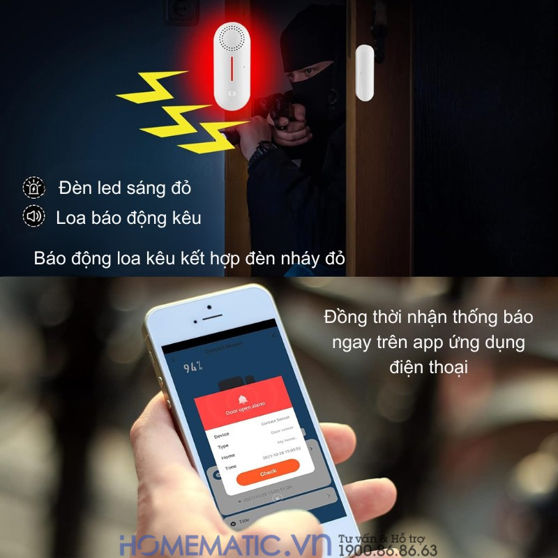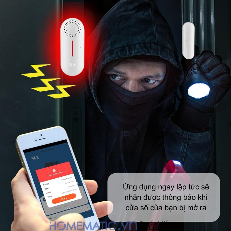 Báo Động Tức Thời, Dù Bạn Ở Đâu: Thiết bị gồm 2 bộ phận nhỏ gọn, gắn ở cửa và bản lề. Chỉ cần cửa mở, còi sẽ hú ngay lập tức và báo về điện thoại của bạn qua Wi-Fi dù bạn đang đi làm, du lịch hay ở bất cứ nơi nào có internet.