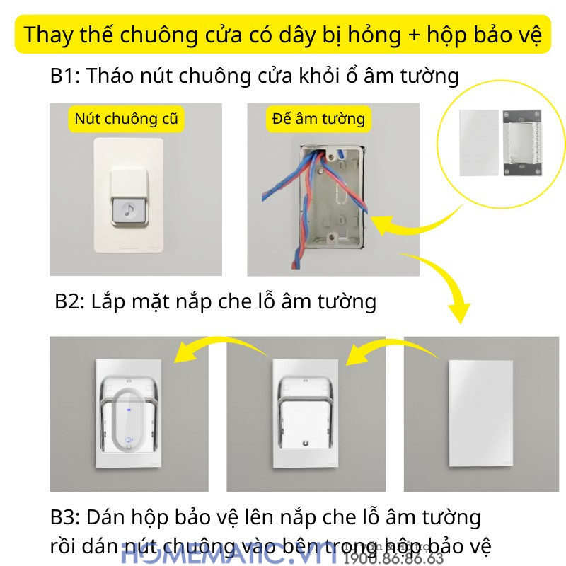 Nêu nút chuông cửa có dây có của bạn bị hỏng, sau đây là cách sử dụng phụ kiện mặt nắp ổ âm tường để lắp đặt thẩm mỹ hơn: