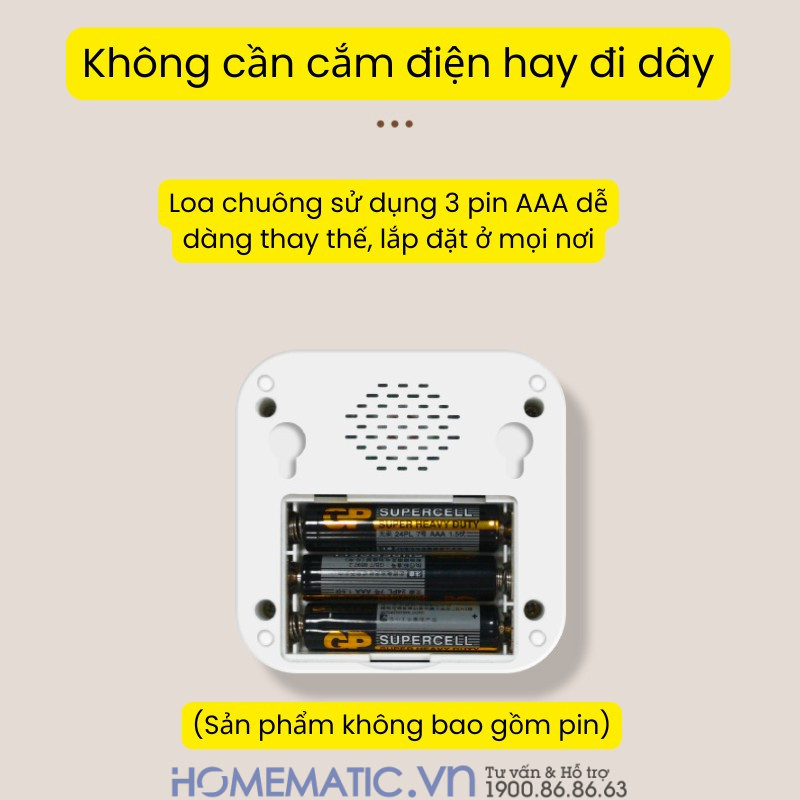 Cả loa và nút bấm đều dùng pin tiện dụng, dễ thay, không cần dây điện. Loa có cổng microUSB để cắm nguồn liên tục, hoạt động ổn định 24/7.