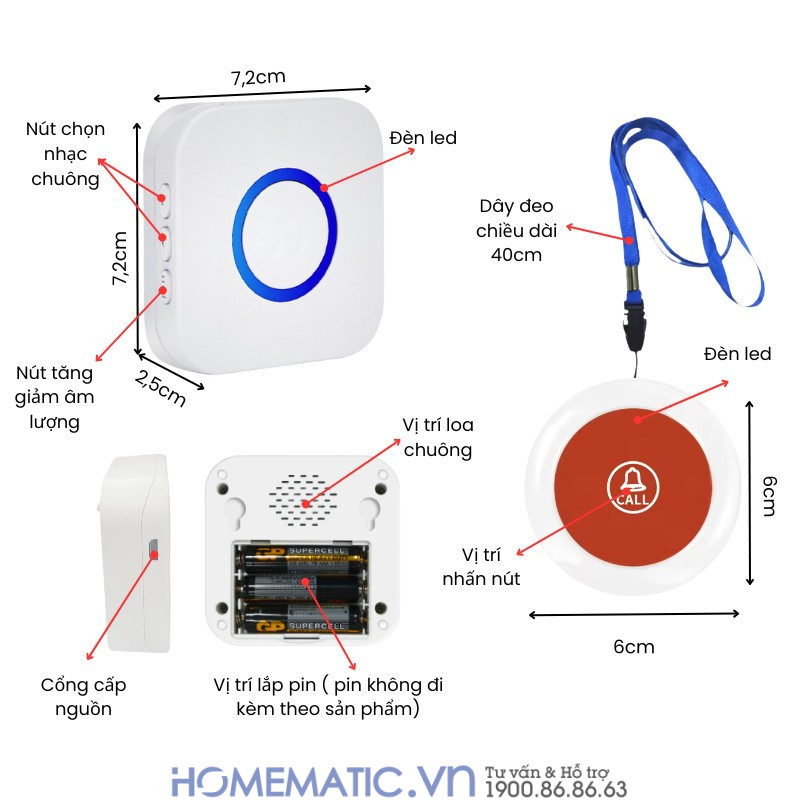 | Kích thước | Nút nhấn: Dài 6cm x Rộng 6cm x Cao 1,6cm Loa chuông: Dài 7,2cm x Rộng 7,2cm x Cao 2,5cm |