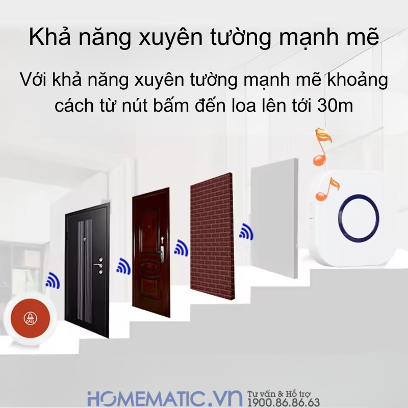 Phạm vi hoạt động rộng: Với khoảng cách kết nối không dây lên đến 30-50m, bộ chuông phù hợp cho cả nhà tầng hoặc căn hộ lớn. Dù ở phòng khách, phòng ngủ hay nhà vệ sinh, tín hiệu vẫn luôn rõ ràng.