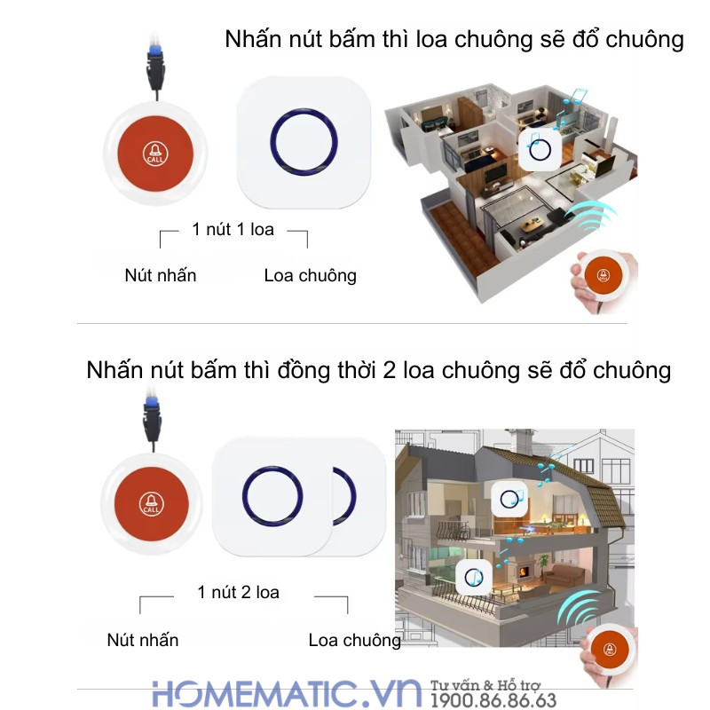 Ngược lại, có thể ghép nhiều loa cho 1 nút bấm, ví dụ: đặt một loa ở phòng khách, một loa ở tầng 2, đảm bảo bạn luôn nghe được dù ở vị trí nào trong nhà.