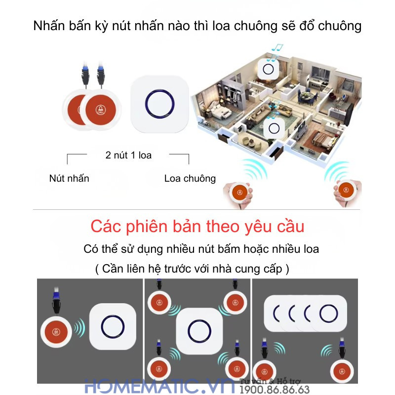 Kết nối linh hoạt: Bạn có thể lựa chọn phiên bản nhiều nút bấm cho 1 loa ,ví dụ đặt một nút ở phòng ngủ, một nút ở nhà vệ sinh, một nút ở bếp, giúp người già gọi bạn từ bất kỳ đâu.