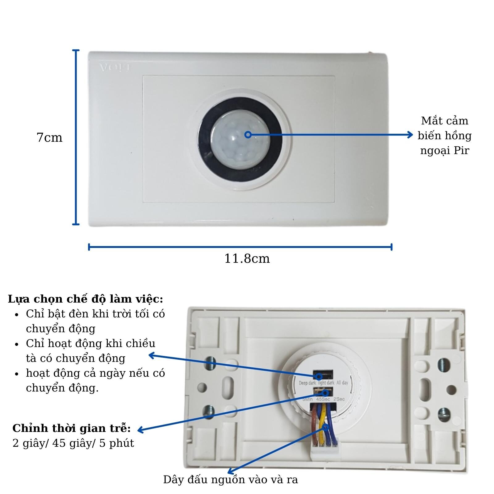 | Thời gian trễ | 2 giây / 45 giây / 5 phút (Tùy chỉnh) |