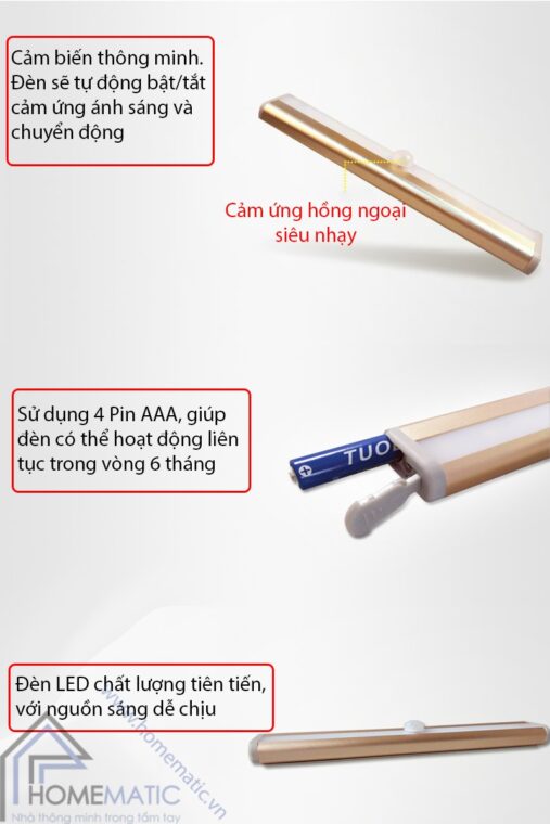 Với chiếc đèn LED này, bạn sẽ không lo khi mất điện, có thể gắn ở bất kỳ chỗ nào mà không cần quan tâm đến việc kết nối dây điện, ổ cắm. Đèn sử dụng 4 Pin AAA có thể dùng tối đa 6 tháng.