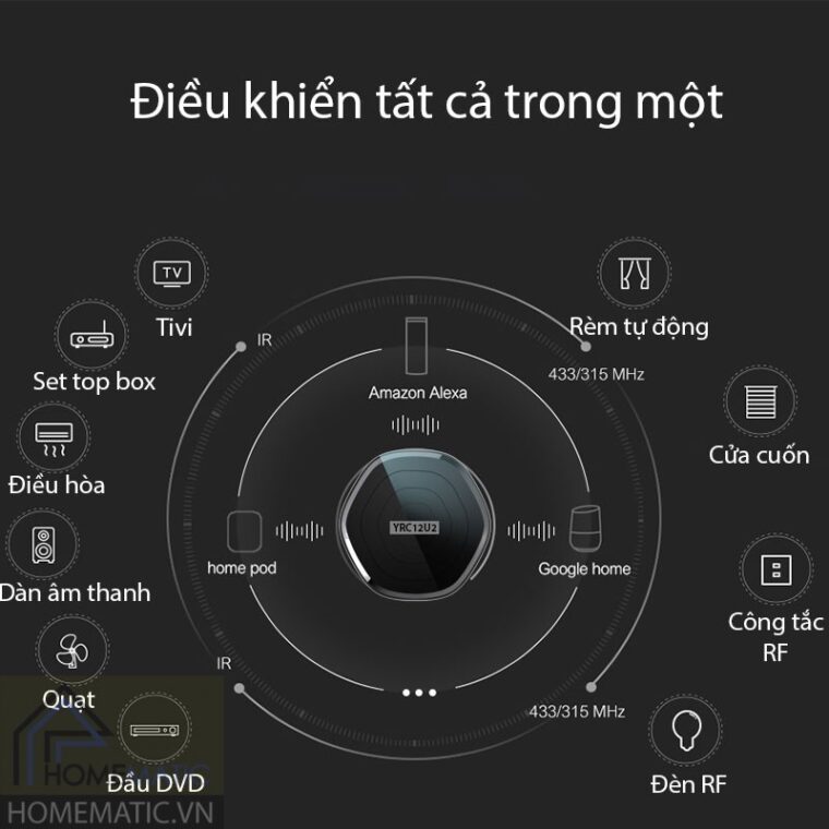– Điều khiển từ xa các thiết bị dùng remote RF như các công tắc, ổ cắm, bóng đèn, rèm cửa, cửa cuốn…